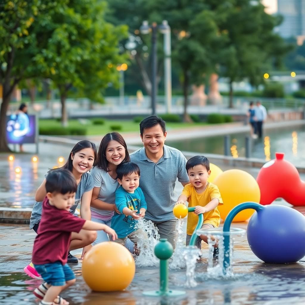 - 圖片說明:孩子在綠地與水景間進行互動遊戲,臨時裝置與自然環境成為最佳背景。Image generated by AI.