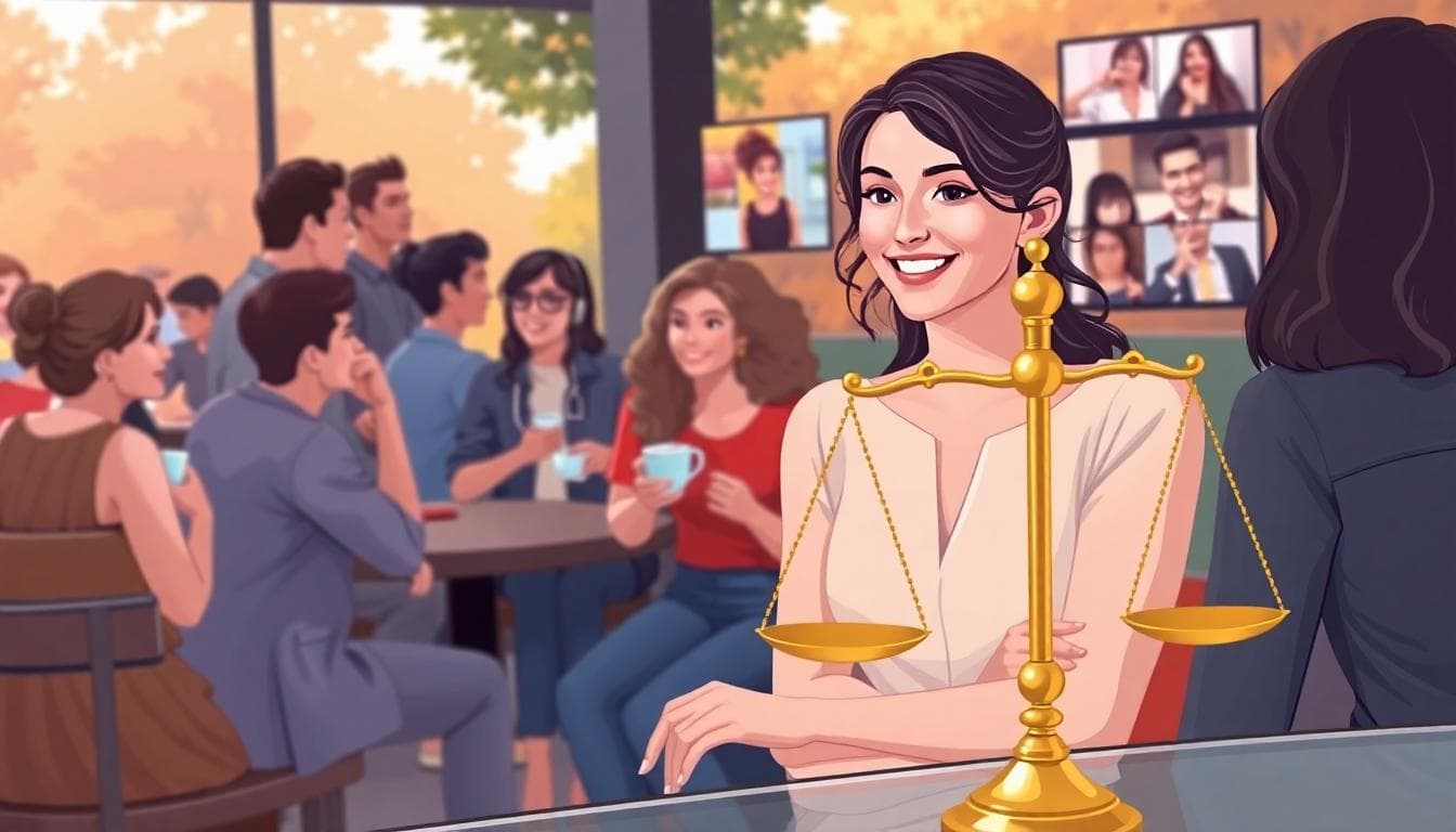 - 圖像展示:天秤座個體在熱鬧聚會中展現自信與魅力,背景是咖啡館與戶外場景,畫面風格現實寫實,帶有柔和的暖色調與金色點綴。Image generated by AI。