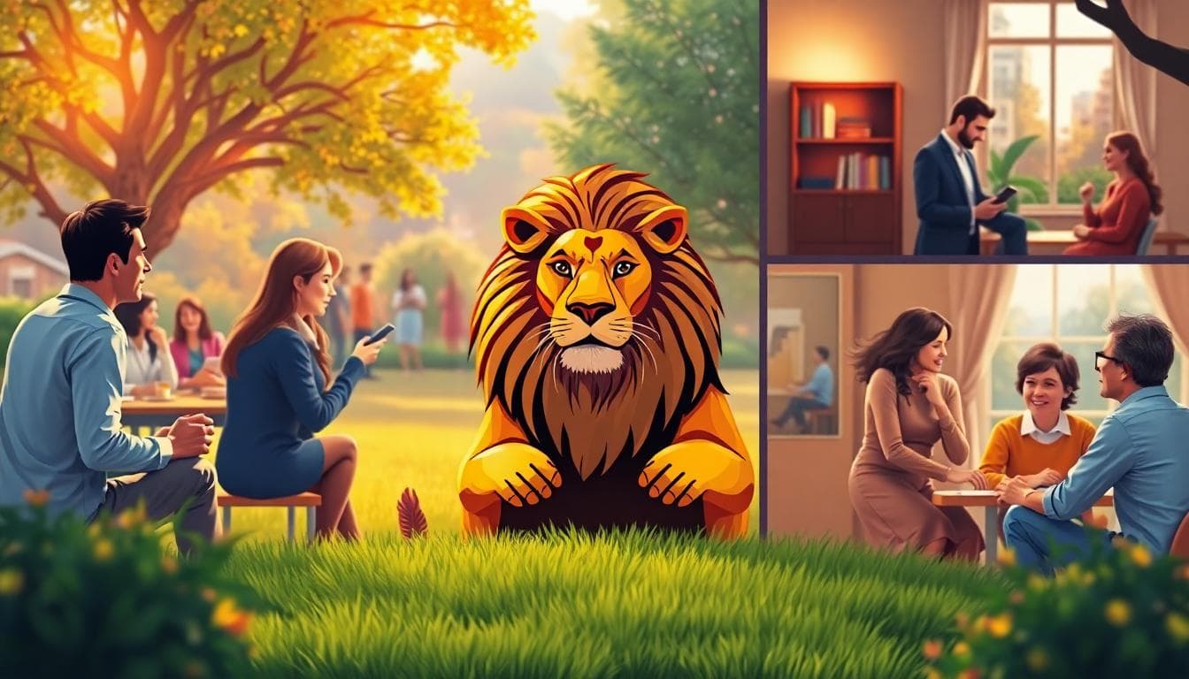 以下圖片由 AI 生成,展示獅子座在不同情境下如何表達界線,背景明亮、氛圍友善,焦點在於自信而不壓迫。