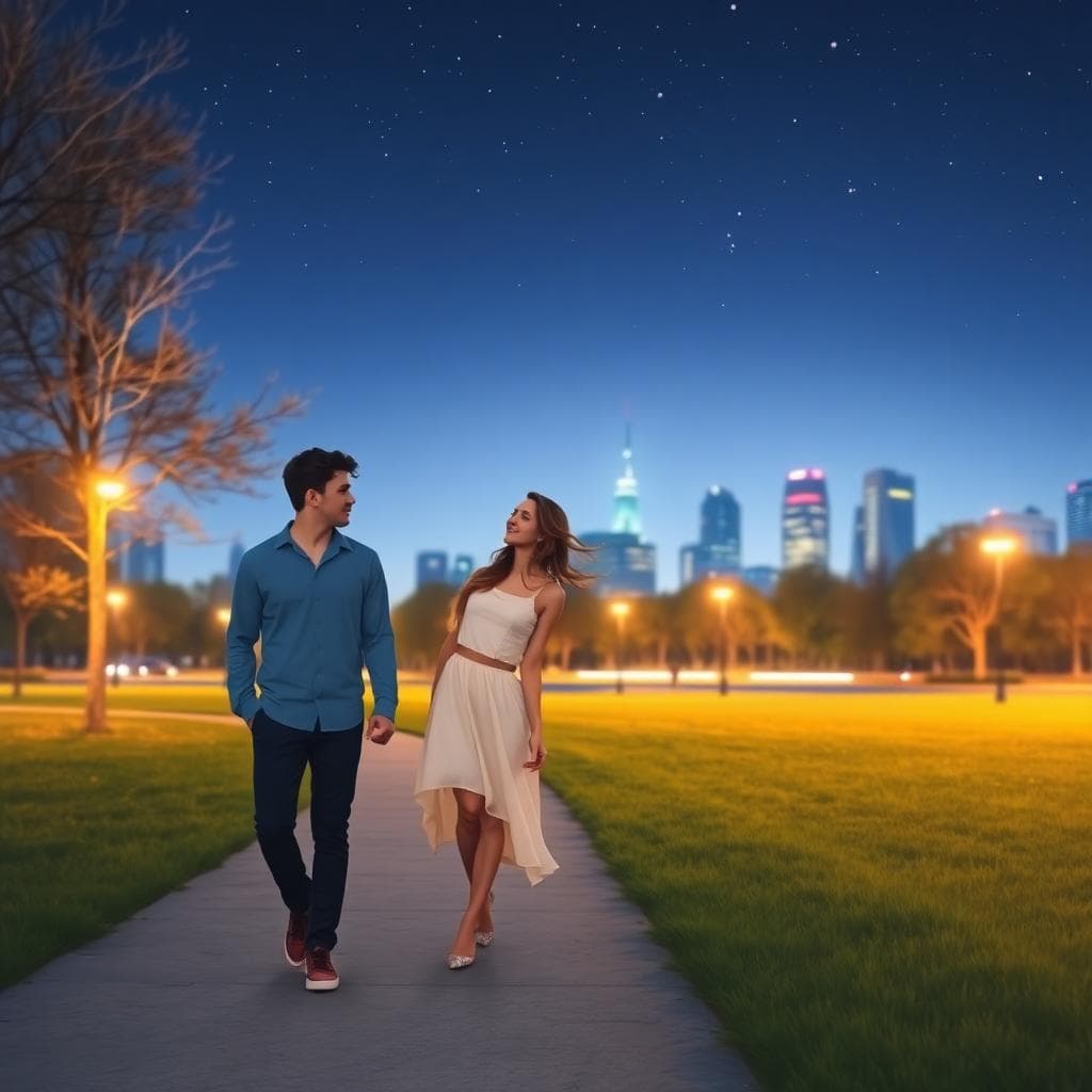 - 圖像呈現一對情侶在公園散步,彼此保持適度距離卻眼神交流,氛圍溫柔而自然。Image generated by AI