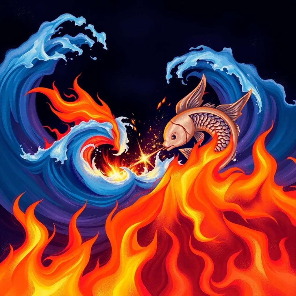• 圖像說明:以下 AI 圖像呈現火水共舞的視覺意象,象徵從衝突到和諧的過程。