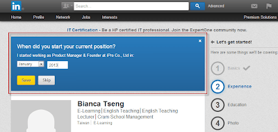 4.再來LinkedIn會開始一步步的詢問您的基本資料,詢問的內容如下(並非依跳出順序排列)